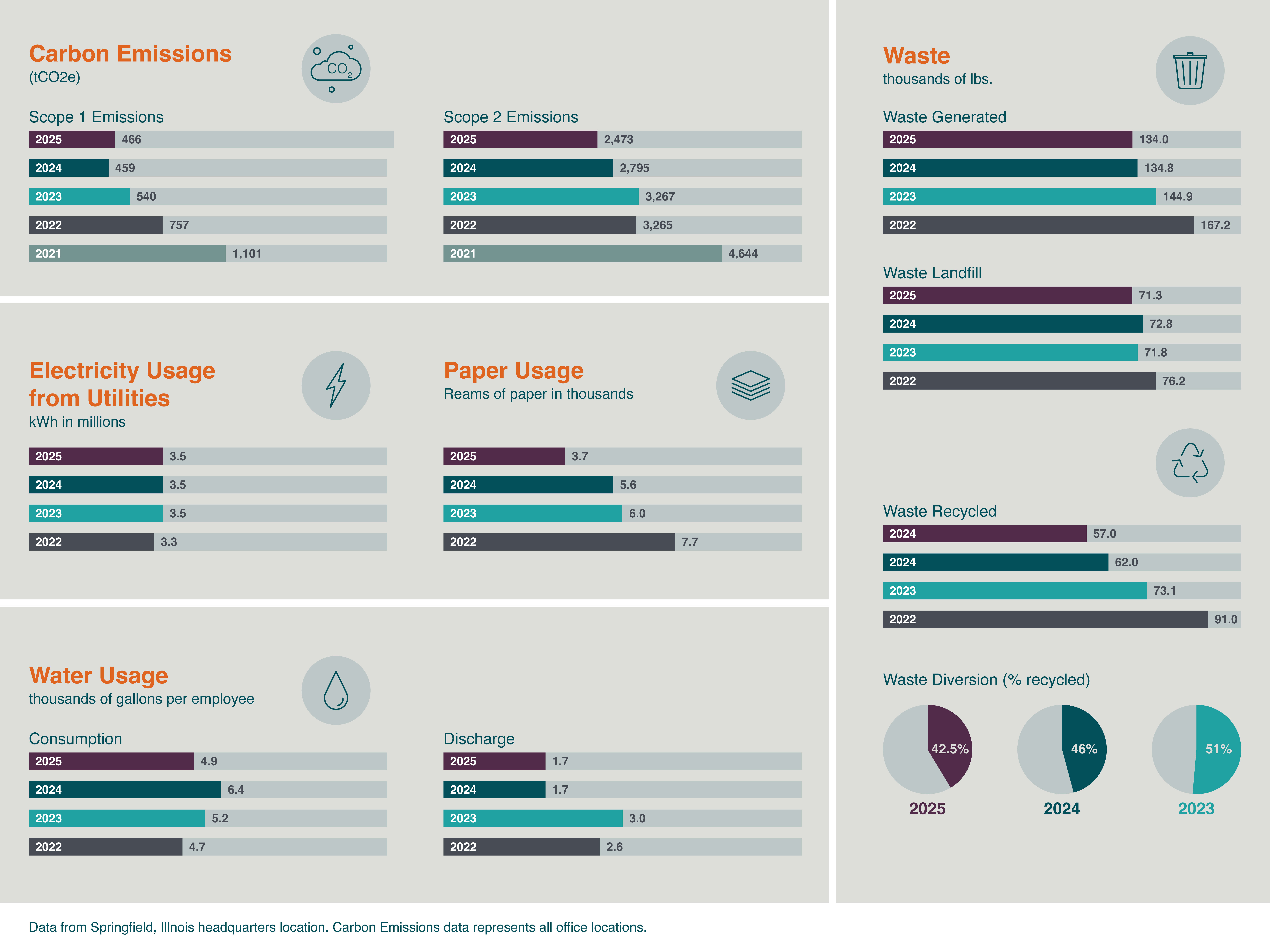 - Reduced water usage: Water consumption at our Springfield headquarters location in 2025 was nearly 36% below 2020, although it has risen from an artificially low level during the pandemic as employees return to the office with greater frequency. We continue to focus on conservation initiatives, such as improving ground irrigation, updating plumbing, and promoting conservation practices within our office.
